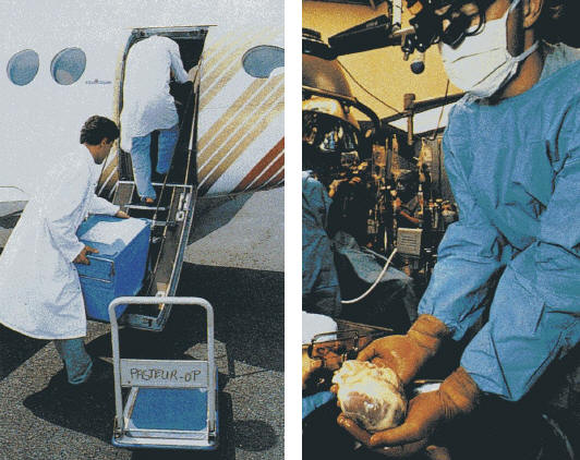 Greffe de cœur humain [ "... Depuis Décembre 1967, date de la première greffe cardiaque, les techniques mises en œuvre ont considérablement évolué. Le donneur est un individu en état de mort cérébrale, mais dont le cœur fonctionne encore. Le cœur est progressivement refroidi par injection d'un liquide à 6°C, ce qui a pour effet d'arrêter les battements et d'éviter sa détérioration. Après le prélèvement, le cœur est maintenu aux environs de 4°C par immersion dans un liquide glacé, et transporté ainsi jusqu'au receveur. Le chirurgien procède alors à la greffe proprement dite chez un receveur dont le cœur a été enlevé et dont le sang circule temporairement de façon extracorporelle. Aucune connexion nerveuse ne peut techniquement être rétablie entre l'organisme du receveur et son "nouveau cœur". La température du cœur est progressivement remontée et le cœur recommence à battre à un rythme d'environ 90-100 battements par minute (donc à un rythme plus élevé que la normale). pas plus de 6 heures se sont écoulées entre le prélèvement et la greffe." (D'après Bordas 2000). |