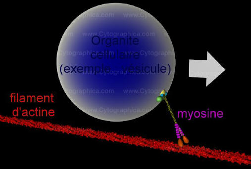 Le mécanisme de la cyclose (mouvement des organites cytoplasmiques : chloroplastes, vésicules synaptiques, vésicules de sécrétion, vésicules golgiennes) Les mouvements des organites dans la cellule sont dus à l'existence au sein de la cellule d'un cytosquelette. Les organites cytoplasmique (chloroplastes, par exemple) sont accrochés sur des protéines contractiles (filaments de myosine) qui sont elles-mêmes fixées sur des "rails" constitués par des filaments d'actine. Lorsque les myosines se déplacent sur les filaments d'actine, les organites cytoplasmique suivent !