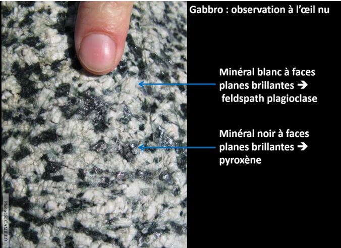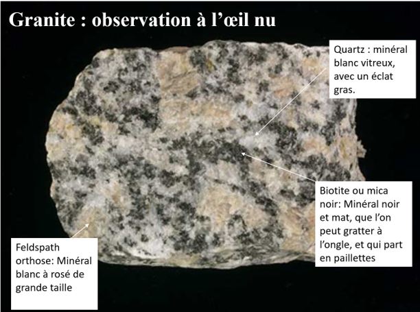 --> la principale roche de la croûte continentale : le granite - étude du granite à l'oeil nu Utiliser l'échantillon de granite et sa lame mince pour identifier : un quartz, un feldspath, un mica blanc, un mica noir --> les principales roches de la croûte océanique: le gabbro et le basalte - étude du gabbro à l'oeil nu Utiliser l'échantillon de gabbro et sa lame mince pour identifier : un feldspath, un pyroxène. Utiliser l'échantillon et la lame mince du basalte pour identifier un phénocristal, une microlite et le verre volcanique