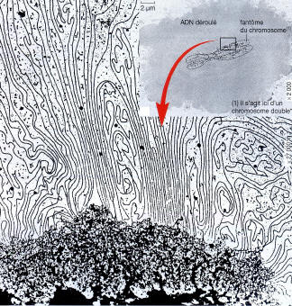 Fragment d'un chromosome double (à 2 chromatides) après action d'enzymes digestives qui démantèlent certaines protéines du chromosome qui contribuaient à la condensation du chromosome pendant les divisions cellulaires. On observe un très long filament d'ADN qui s'étale autour du fantôme du chromosome et qui correspond à une des 2 chromatides du chromosome. |